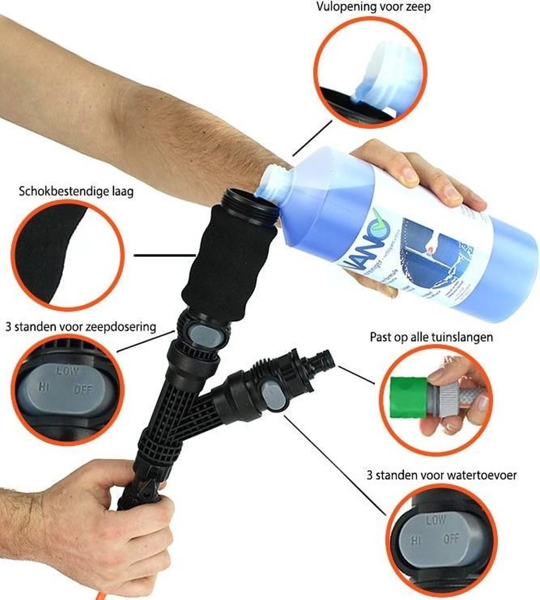 De zeepdispenser plaats je tussen de waterslang van je steel en je tuinslang. Dankzij de verschillende standen regel je zelf de hoeveelheid zeep en water.